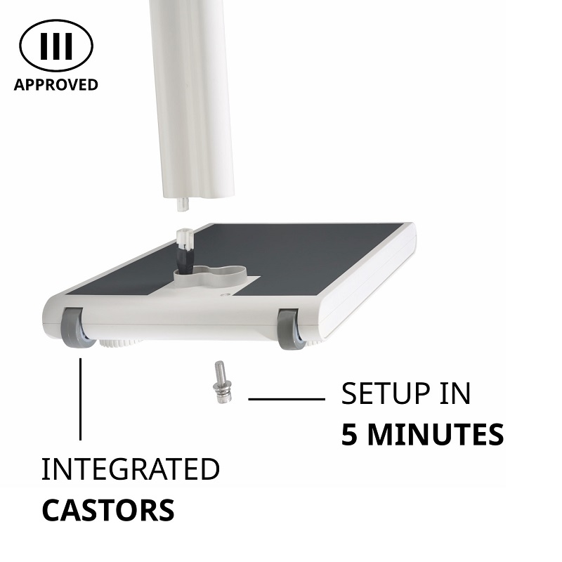 The perfect choice in all medical fields. Heavy-duty electronic column scale with an extra-wide, flat, and slip-resistant platform. The transport castors ensure easy movability. The BMI, hold and mother-child functions provide fast and clear results of the patients’ nutritional condition. The turnable display allows easy reading from the patient and user side. The scale operates by mains and batteries, included as standard. The scale setup is fast and easy: supplied in just two parts and assembled by one set of special screws.