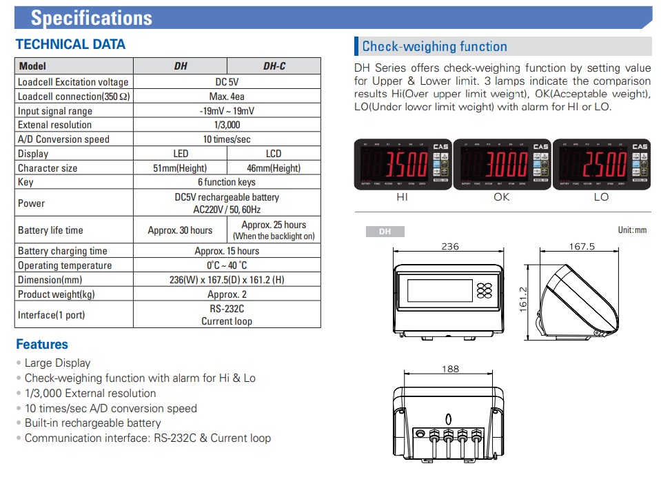 Available Capacity / Division: 60 kg/5g up to 1,000 kg/100g.
