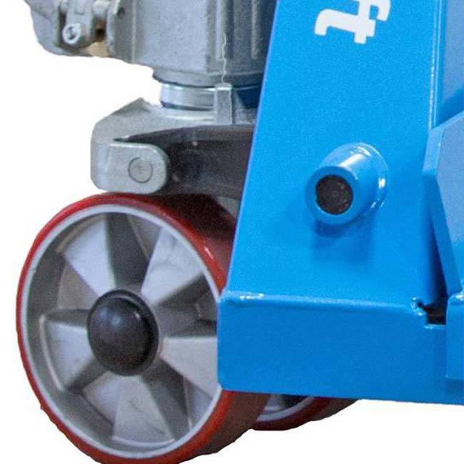 The pallet lift truck M25 has a rugged construction and will not bend under heavy loads. Its steel chassis can take about 25 percent more weight than comparable models of this size. The hydraulics of the M25 are protected from dust and are well suited to long, hard working days, with a minimum of service. The drive wheels and rollers increase handling capacity with their low rolling resistance. The tiller also has a large steering angle on both sides. It’s therefore easy to maneuver the M25 in a tight space, such as the truck loading bays. A broad tiller handle protects the hands from injury. The pallet lift truck M25 has a maximum load capacity of 2500 kg.