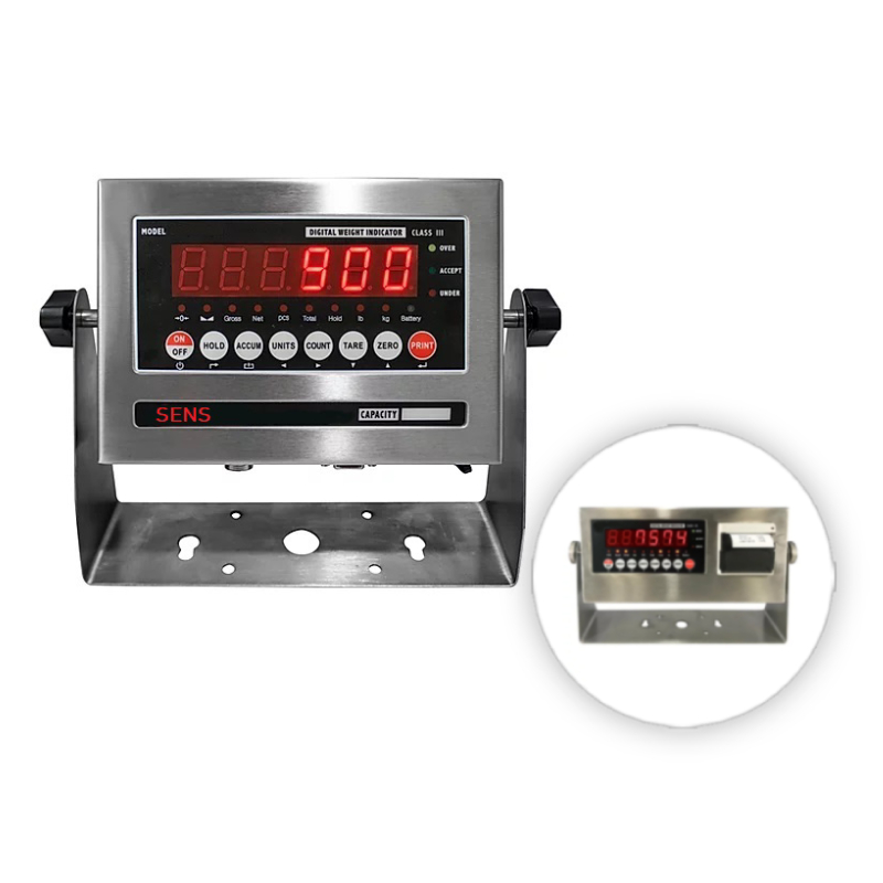 Weighing indicator, LED Display, rechargeable battery, interface: RS232, Weighing indicator, LCD with backlight display, rechargeable battery, interface: RS232, Weighing indicator, built-in thermal receipt printer, LED Display, rechargeable battery, interface: nil