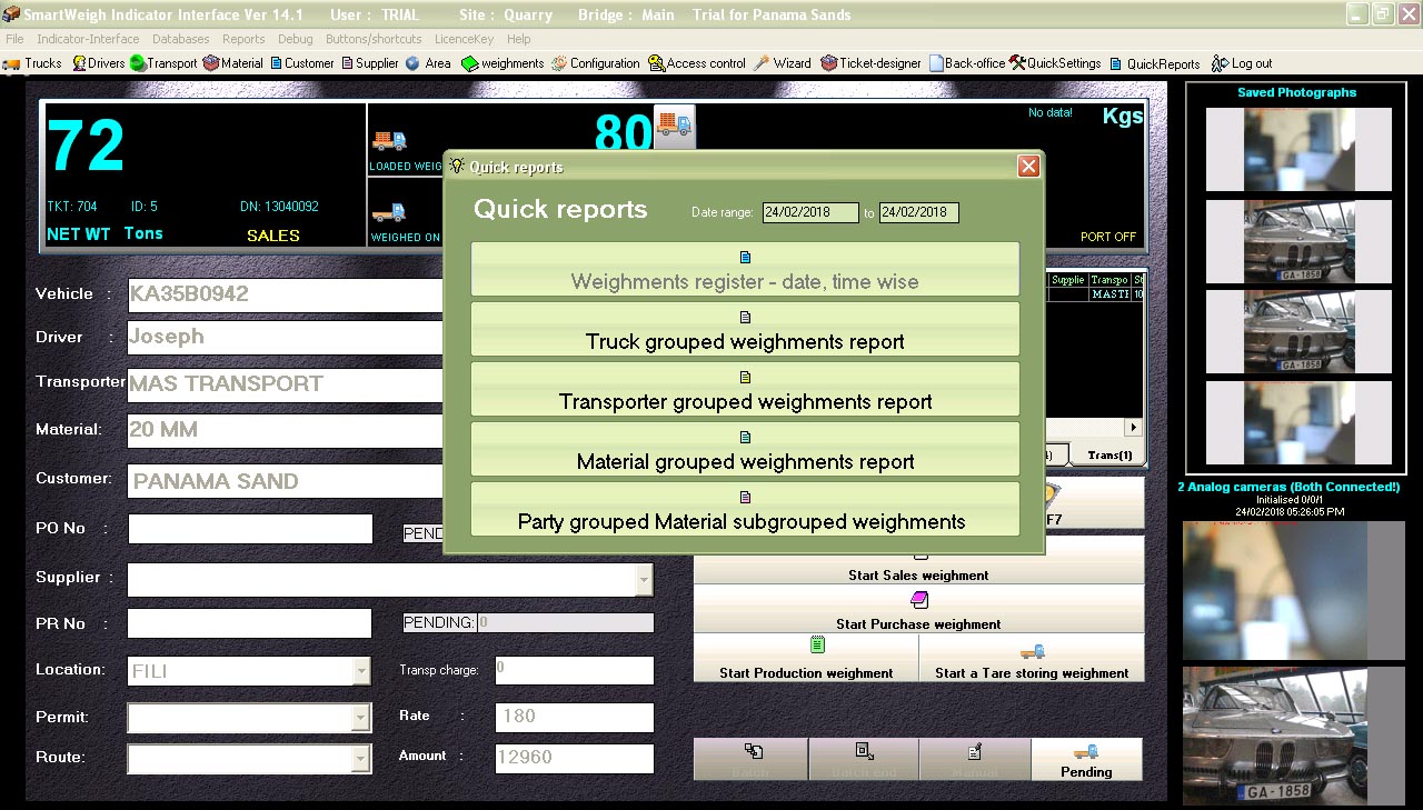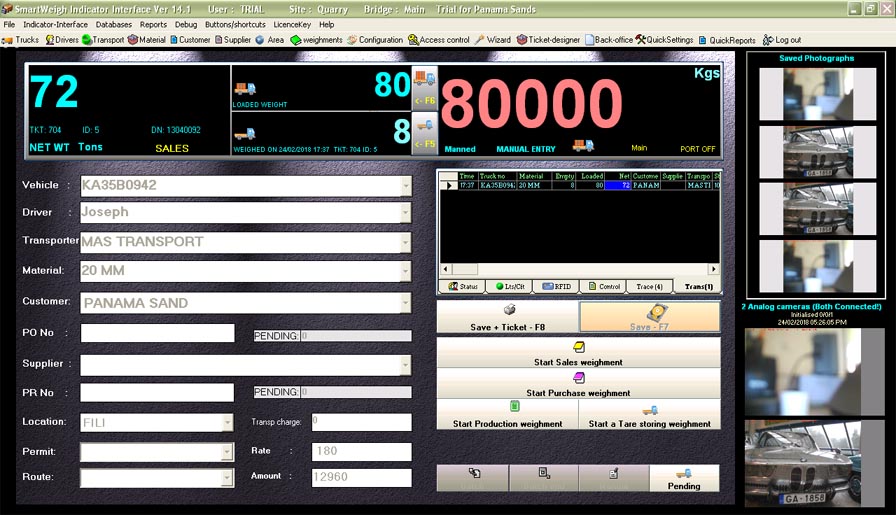 • Smartweigh weighbridge software supports totally unmanned weighment logging.